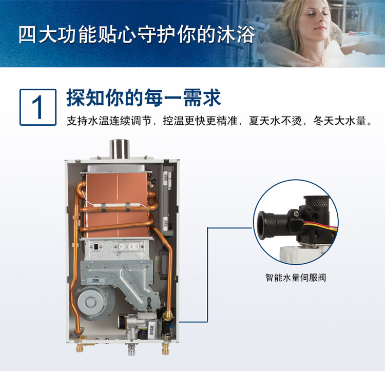 智能恒溫控制系統(tǒng),超寬頻水量調(diào)節(jié)。通過搭載伺服電機,根據(jù)設(shè)定溫度連續(xù)調(diào)節(jié)水量,舒適節(jié)能到極致。一氧化碳探測報警器,細(xì)心呵護您的安全。更有多點控制,可連接兩個遠(yuǎn)程遙控器, 控制更方便快捷。