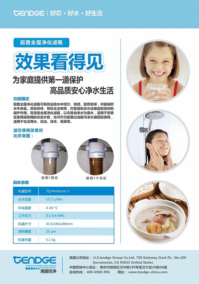 恬凈前置全屋凈化濾瓶TQ-P2能有效去除水中的懸浮物、鐵銹、顆粒雜質、余氯、異色異味,它采用FDA食品級材質,高精度過濾濾芯,體積小巧,安裝方便。恬凈前置全屋凈化濾瓶TQ-P2能承受高水壓,流量超大,智能濾芯提醒功能,節(jié)能環(huán)保。