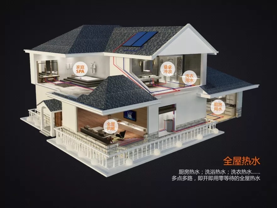 全屋熱水系統(tǒng)四:系統(tǒng)爐+熱泵一體機(jī)系統(tǒng)。此方案除了能夠供多個出水點(diǎn)持續(xù)出熱水外,系統(tǒng)節(jié)能性非常優(yōu)越。